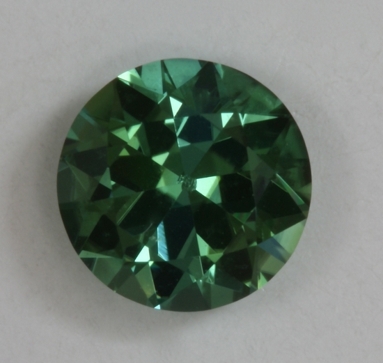 This fine minty blue green standard round brilliant is pretty. Its moderately light inclusions have little effect on the smaller stone. The droplets of color welcome the new addition. It weighs 1.23 carats.