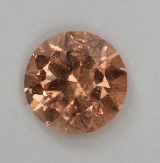 This standard round brilliant has significant inclusions that effect the stone's flash. The stone's pastel peach color is in a medium tone level. It weighs .55 carats.