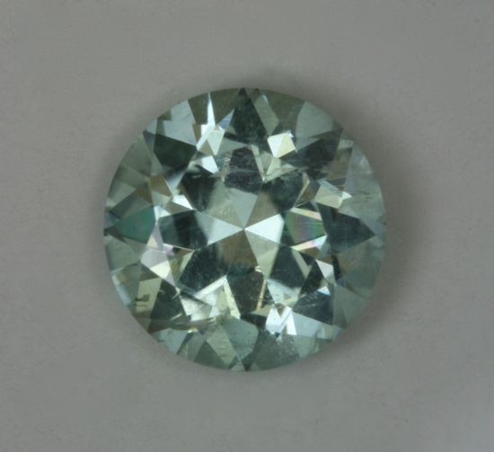 This standard round brilliant is moderately included. The inclusions do impact the flash of the stone. It has a pale pastel green color and weighs .88 carats.