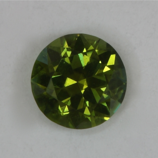 This smaller standard round brilliant is mostly green with a bit of yellow overtone. It appears to be eye clean and and has a medium dark tone level. It weighs .46 carats.