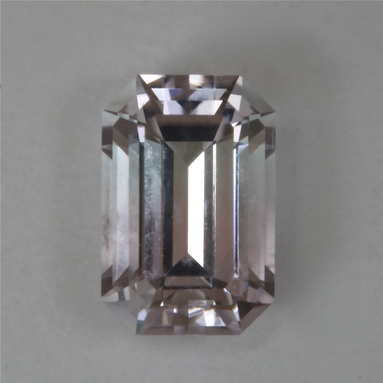 This smaller emerald cut is just lightly included. That doesn't effect the stones brightness and flash. It has a very pale mixture of colorless, pink and blue color. It weighs .70 carats.
