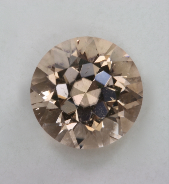 This standard round brilliant is a creamy pastel with light tone level. It appears to be eye clean and flashes in any light. It weighs 2.45 carats.