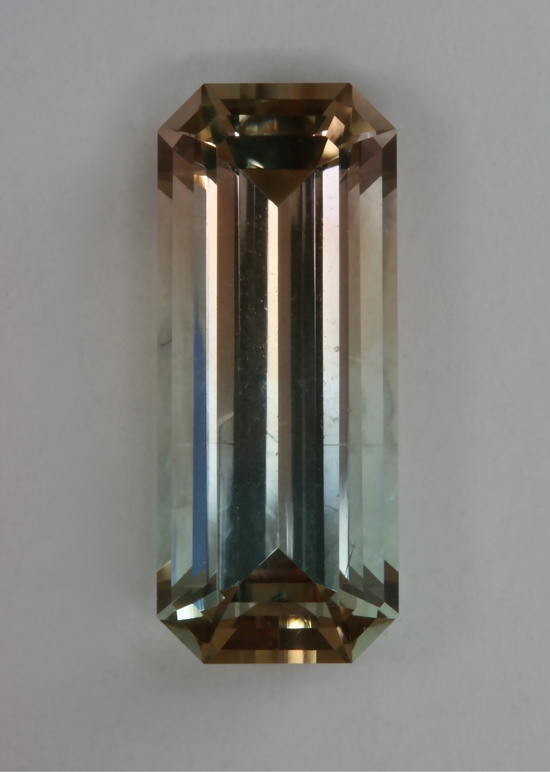 This longer ratio and narrow bi color has a well balanced set of pastel colors, blue and pink. The emerald cut is very pure and bright. It weighs 2.82 carats.