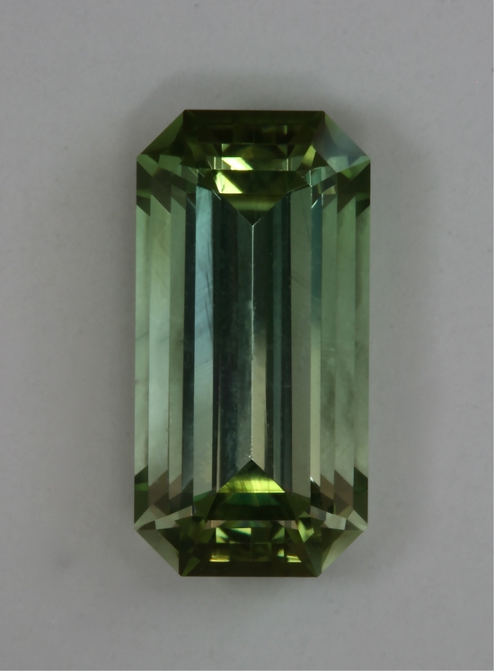 This emerald cut which grades from colorless to celery green is extremely pure. Its bright flash dominates the gemstone when it happens. It weighs 2.91 carats.