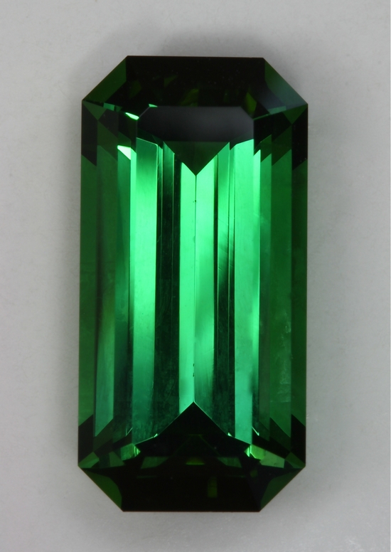 This longer ratio emerald cut has a great grass green color, that is a classic tourmaline color. It is eye clean and has great crystal. it has darker ends, but they are not too significant in larger ratio cuts with great color. It weighs 6.25 carats.