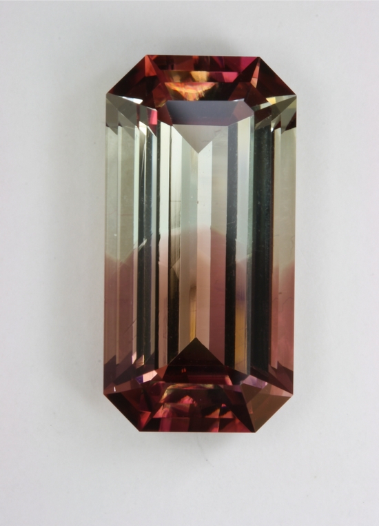 I like this gemstone. Not only is it an eye clean bi color, but the shape of the reddish part show that it was the terminus before the crystal continued to grow. On top of being interesting it is pretty. It weighs 10.19 carats.