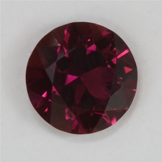 This standard round brilliant has a darker tone value and reduced flash in a red package. It appears to be eye clean, but it does not appear to be particularly transparent. Still it is a pretty dark red round that weighs .79 carats.