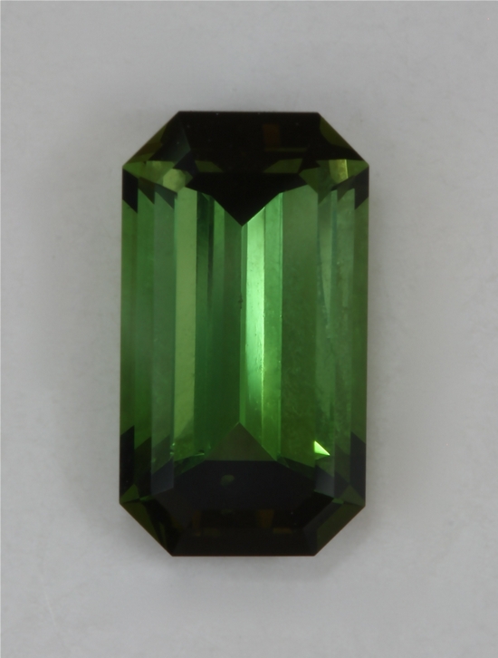 This smaller emerald cut has steeply cut ends to minimize the darkness that comes from having a closed principle axis. Its spicy green color has more yellow in it than many green tourmaline. It appears to be eye clean and be quite transparent, where the closed ends do effect the stone. It weighs1.70 carats.