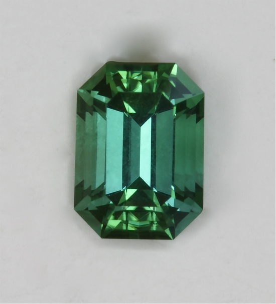 This is a pretty gemstone. It has the classic yellower green c axis color in the ends of the smaller emerald cut and bluer green sides. It appears to be eye clean and have fine crystal. It weighs 1.06 carats.