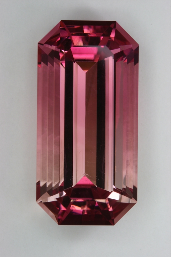 This larger emerald cut is a bi color, it goes from pink to cream. #938