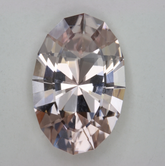 It is amazing how tourmaline has such a wide range of tone values in it colors. This peach oval is just one step away from being colorless. There is no place to hide a flaw in this extremely bright, flashy open oval with a step cut crown. And I did not have to try to hide because there are no imperfects here. It weighs 5.77 carats.