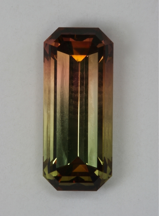 This emerald cut has a very good balance of the three colors, pink yellowish and green. It is eye clean and each color has enough tone to be seen easily. It is even flashy for an emerald cut because it has excellent crystal. It weighs 3.29 carats.