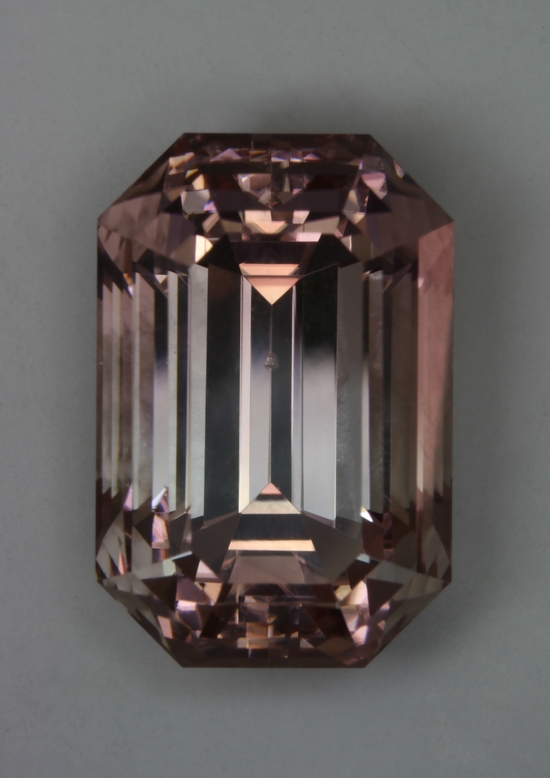This bright, flashy, highly transparent emerald cut is not very dichroic. But its ends are slightly darker and with a somewhat better saturation than the sides. It appears to be eye clean, but there is a tiny, noticeable chip on the keel that is made apparent at close range because of the emerald cuts excellent crystal and light tonal value. It weighs17.6 carats.