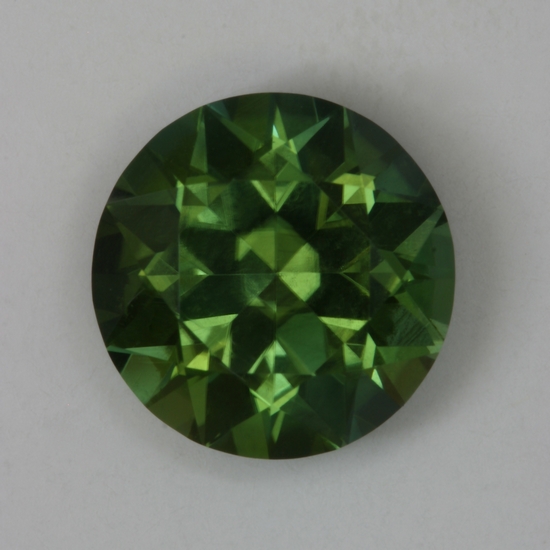 This standard round brilliant has a bright uniform green with darker elements, face up, but you can still see the bluer secondary axes when you tilt the stone. The stone has excellent crystal and weighs 3.22 carats.