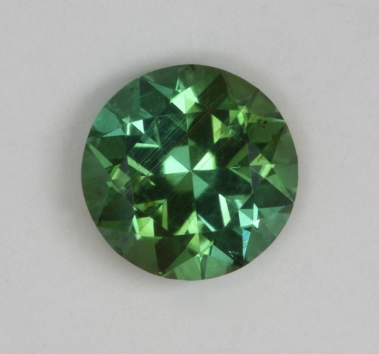This smaller standard round brilliant is mildly dichroic and has a medium toned blue green color. There are eye visible growth tubes at an angle under the table. They are not noticeable without effort. It weighs .99 carats.