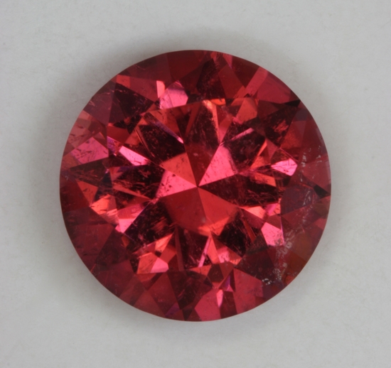 This standard round brilliant has an fine, medium dark toned, orangish pink color. The stone has a significant field of inclusions, that do not flash. The inclusions do muffle the flash of the stone a bit, but I don't find them obnoxious. This bit of a different stone weighs 3.24 carats.