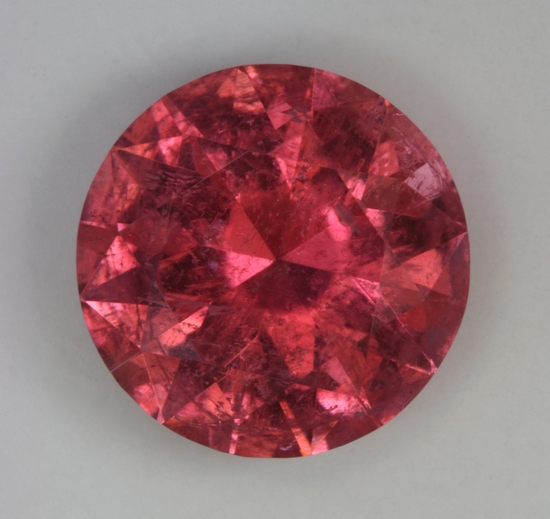 This pink standard round brilliant's color may not be as vivid as some, but its field of bright reflective inclusion helps give it that candy look. The stones flash is affected by the inclusions, but it is still bright and pretty. It weighs 4.82 carats.