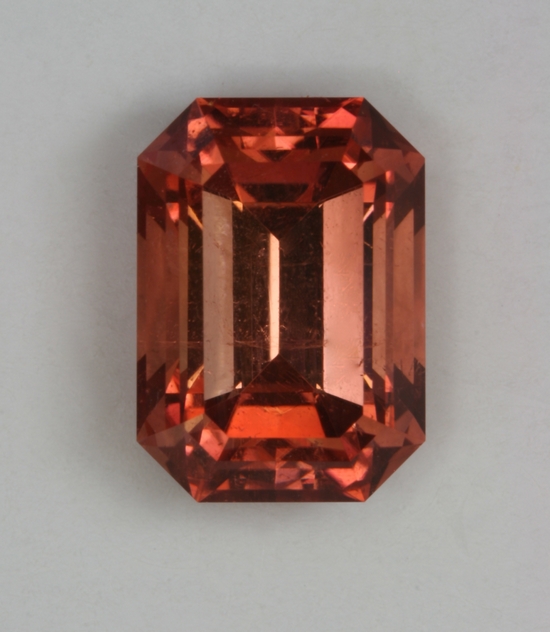 Mildly dichroic, completely vivid peach, bright emerald cut. #1077