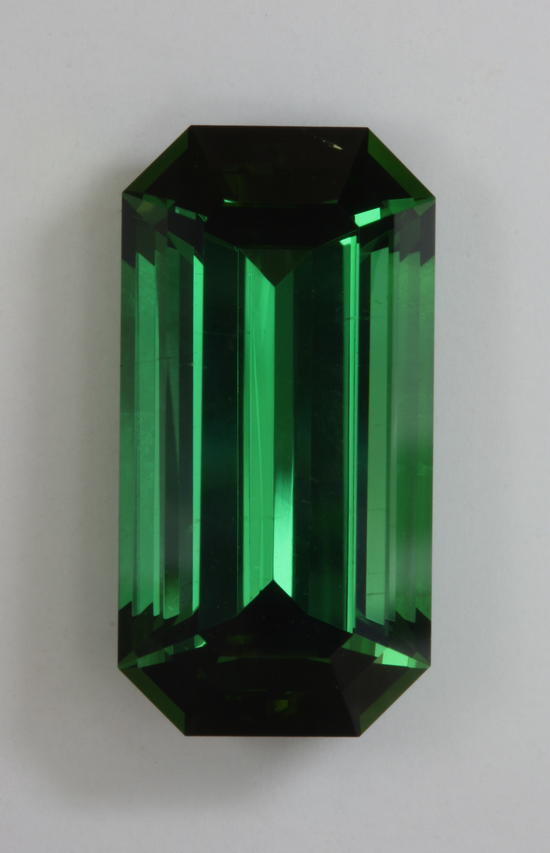 This beautiful large green emerald cut is a tower of green power. The bands of beautiful green seem to go on forever, but are seated in cups of flash from the reflection of the a/b axis off the ends when it is moved. The ends are dead/dark when stationary or moved without tilting, but the gemstone has a large ratio of length to width that lessens this effect without demanding steep ends. So a cutter’s choice has been made and the wonderful medium grass green and purity of this impressive tourmaline shines brightly in the collection. It weighs 12.30 carats.