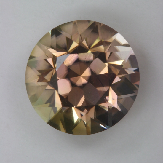 Pink and green makes beige, Nigerian round.  #96 This standard round brilliant appears eye clean and is a bright mixture of pink and green. The pink and green can more or less mix into a beige. It is an interesting stone and weighs 4.40 carats.