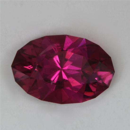 This oval has one white feather on the side of the table that does not flash. It color goes from rich pink to orange depending on the white light. It weighs 1.56 carats.